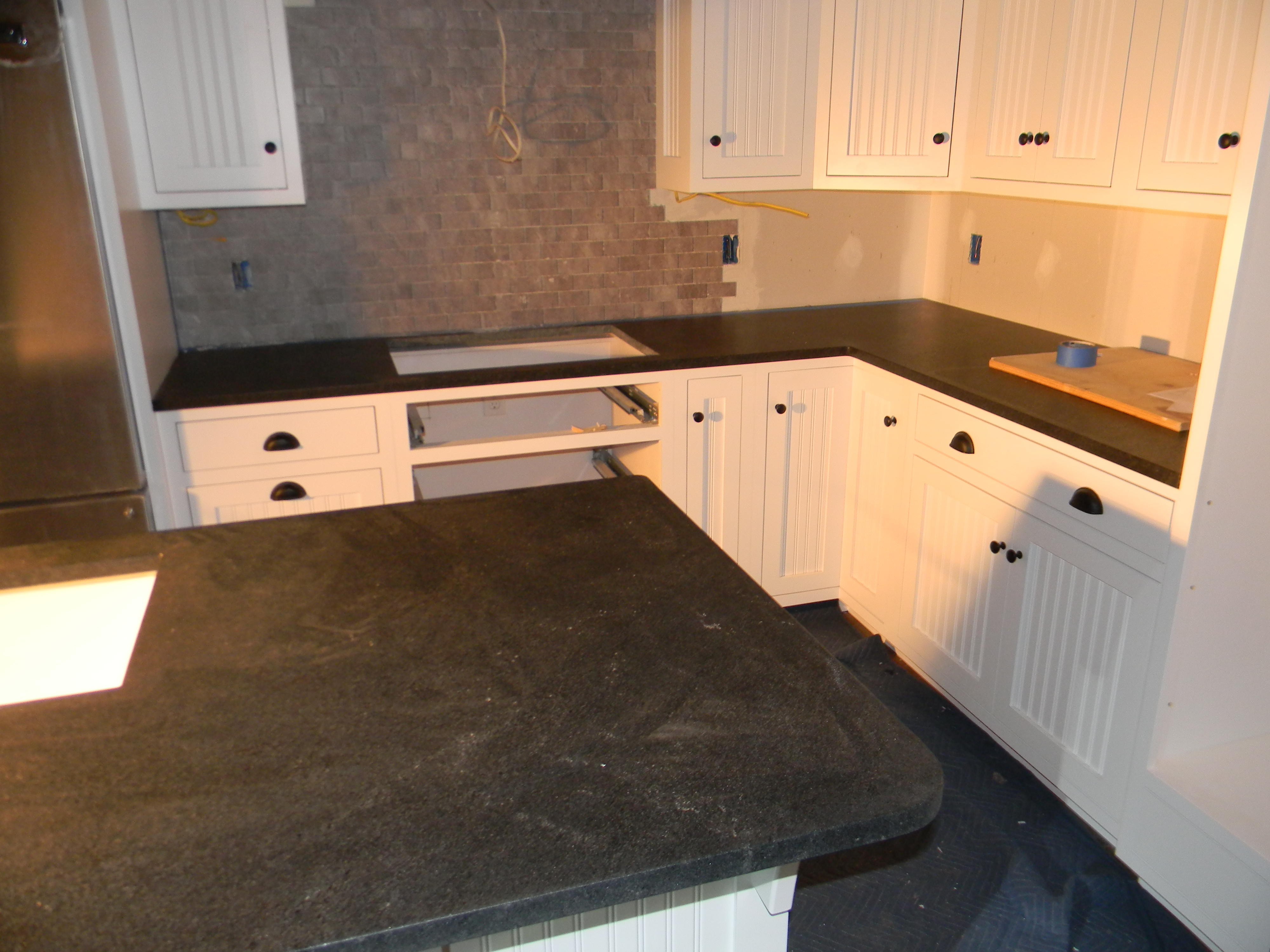 The kitchen — still a work in progress, but we have counter tops and the beginning of a back splash.