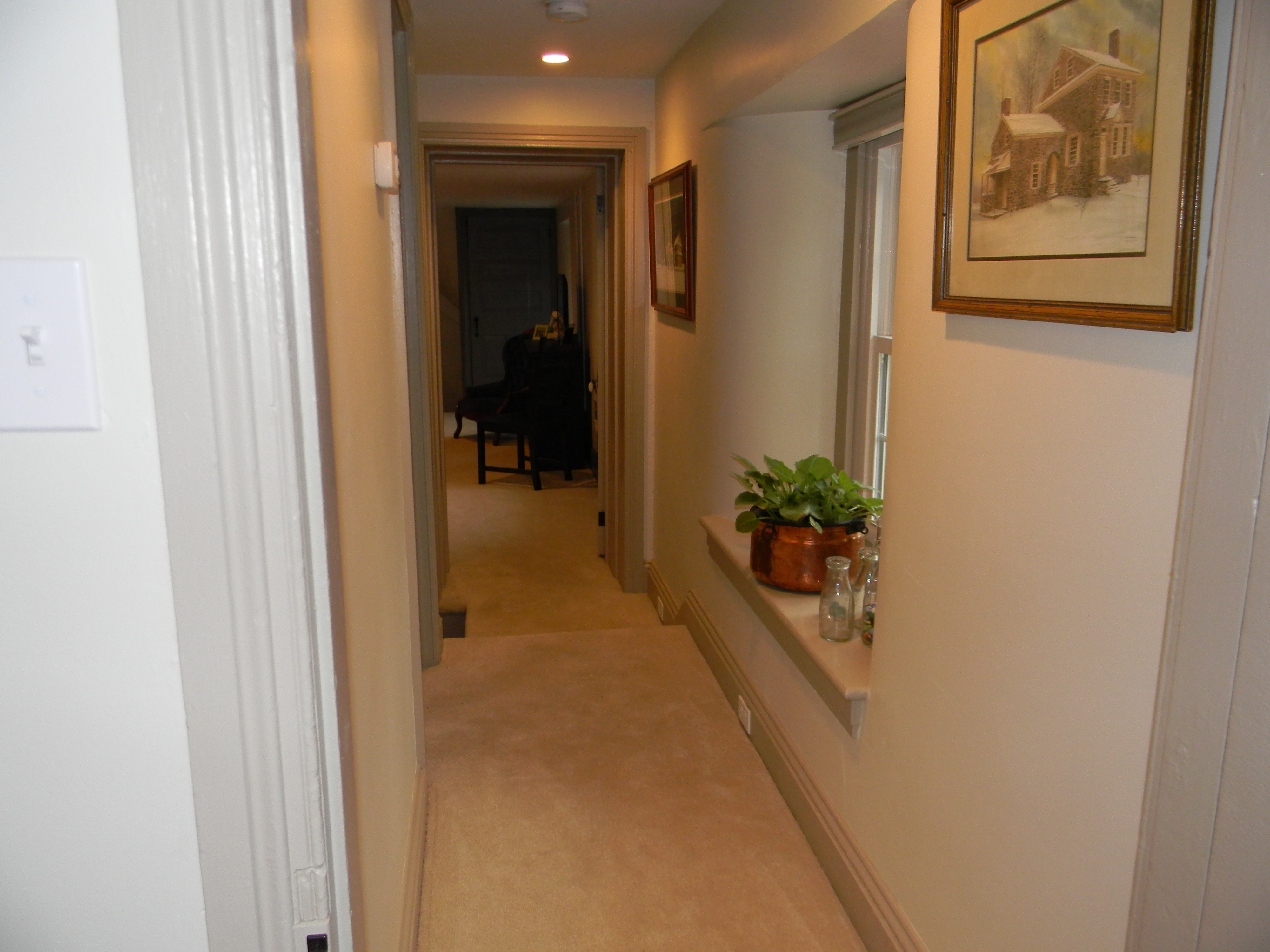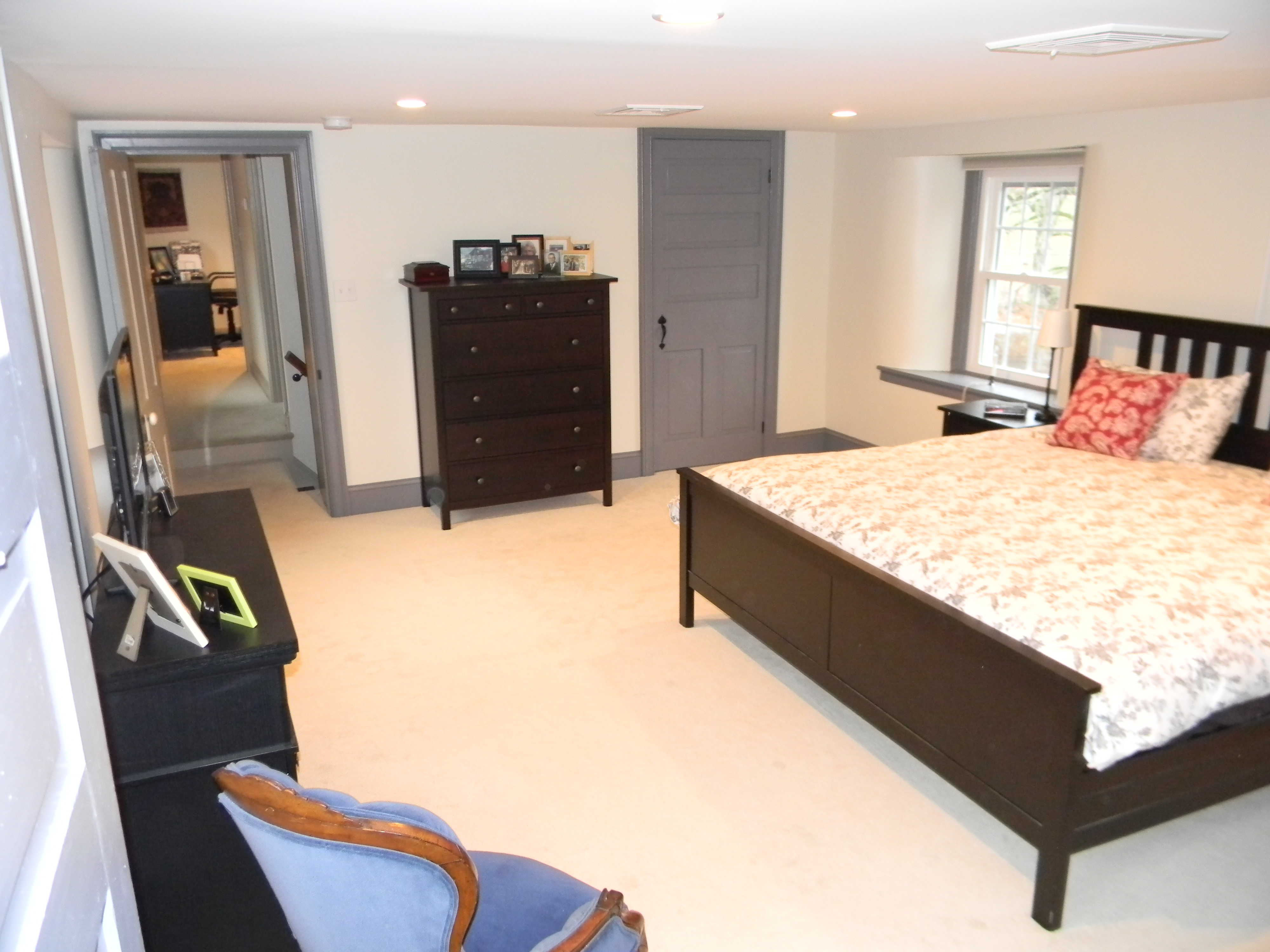 As with everything else, it just took a plan. We knocked down the wall between the two small rooms and turned it into one gracious space. It was definitely one of the better decisions we made. The Master Bedroom is spacious and full of light with two windows facing the front yard and two windows facing the back. Out the front window, we watch the activity at the bird-feeder (we have Nuthatches, Cardinals, Wrens, Blue Jays, Red-bellied Woodpeckers, Downy Woodpeckers, and squirrels who apparently think they are birds). Out the back window we watch the deer who graze their way through the backyard at dusk every evening. And I can use the tiny “back-stairs” to go directly from the Master Bedroom to the Kitchen, should I have a midnight snack attack — how convenient.