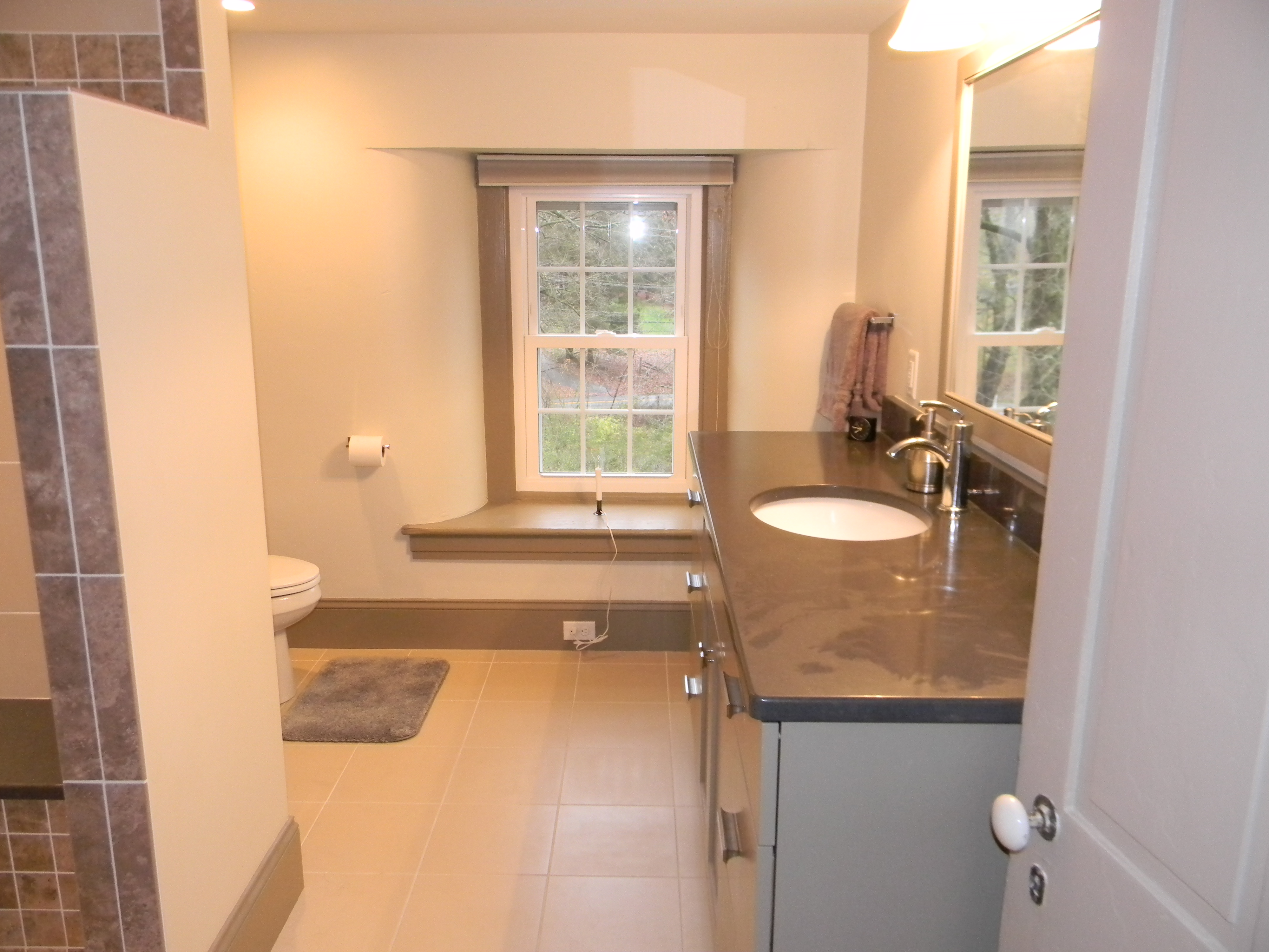 We reconfigured a closet that was in the bathroom and opened it up in the bedroom instead. It wasn’t an easy task for John and his crew. The wall was two feet thick and solid rock; it took some muscle to knock it down. In the bathroom we converted the nasty tub into a walk-in shower, added a floor to ceiling cabinet for a linen closet and a bathroom vanity with lots of drawer space!