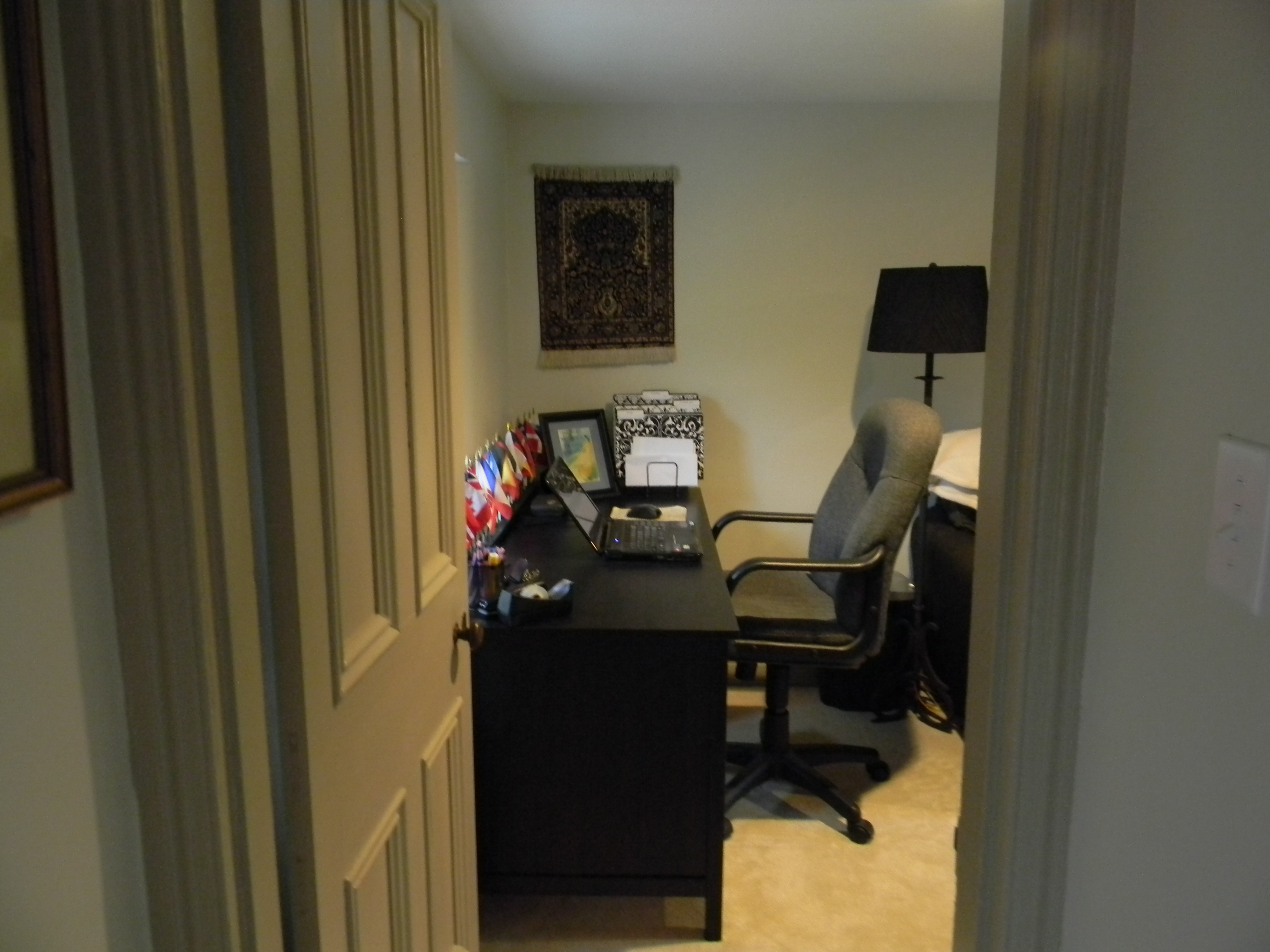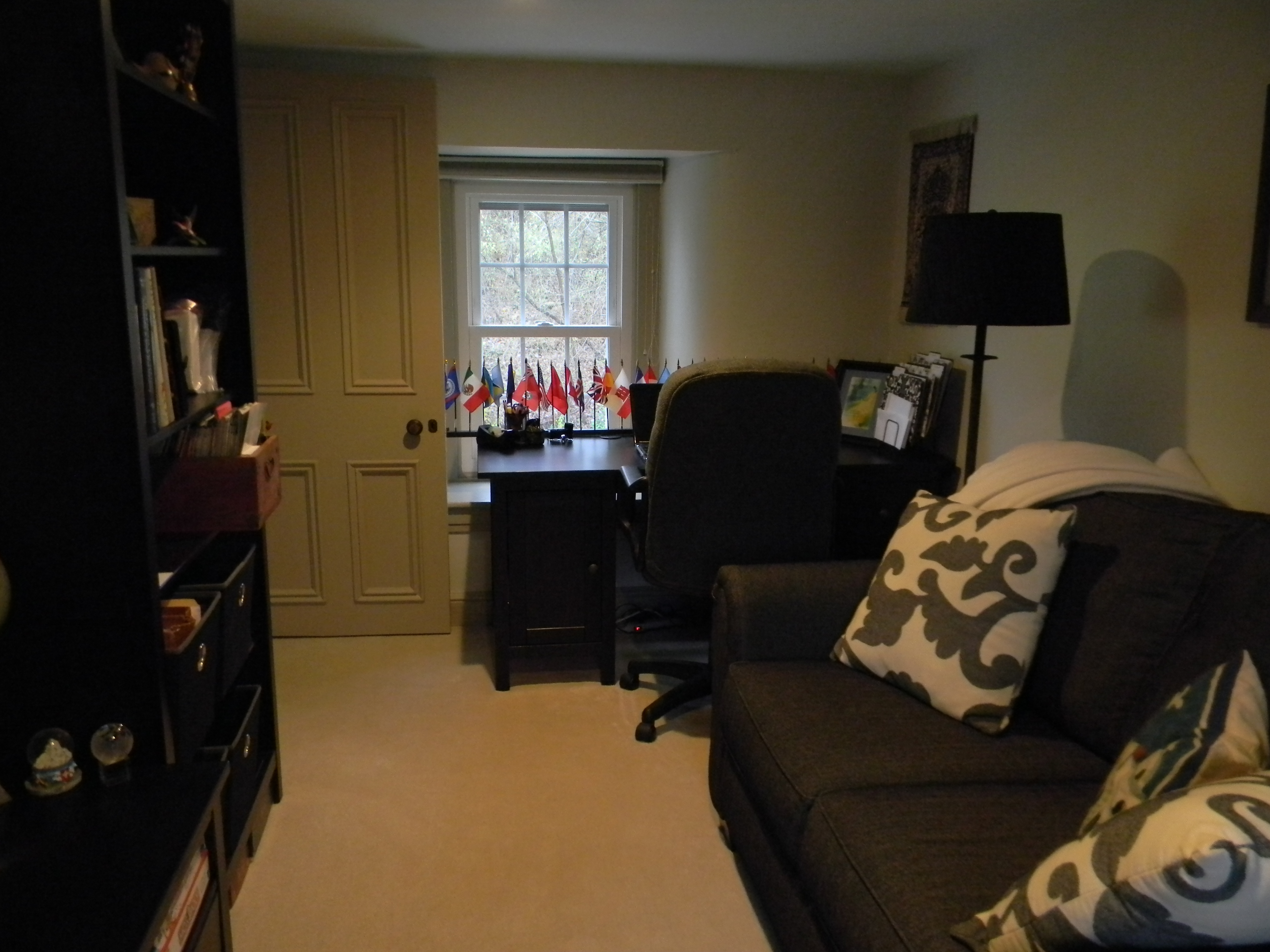 And then here was the tiny room at the other end of the hall. It’s wasn’t really big enough for a bedroom. It was a little too big for a closet (though visions of a wonderful room-sized closet did cross my mind). It became the perfect spot for a quiet retreat and a home office. The ceiling is low in this room. It’s only 80″ tall (that’s 6’8″). We bought bookcases that are 78″ tall. I held my breath as we moved them in to place, I wasn’t sure they would fit. But they did, just barely. In fact, they look like “built-ins,” and they are the perfect place to display tchotchkes from our various trips. It looks like it was meant to be just like this. Not just the upstairs, but the whole house. It was meant to be our home.
